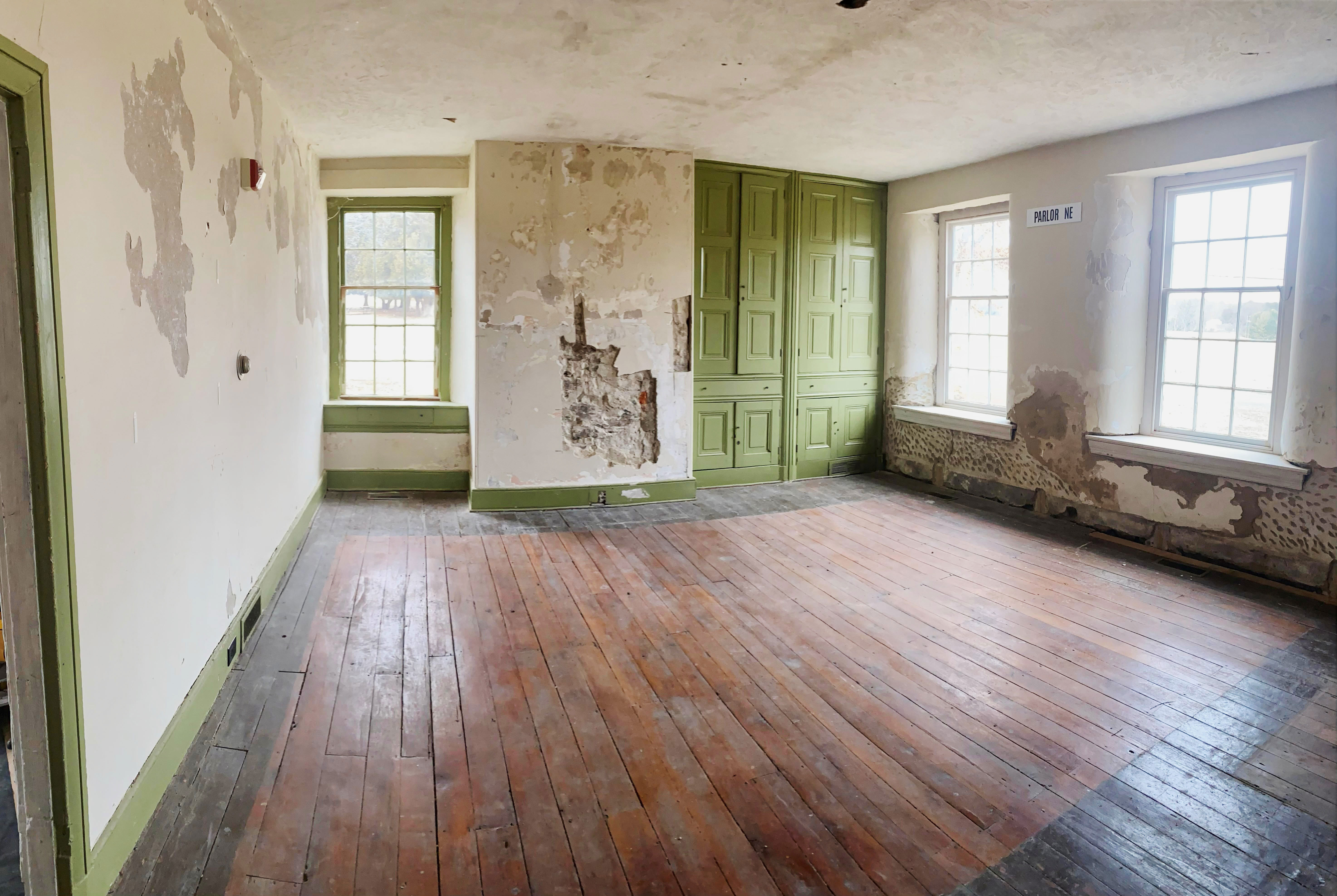 We have been awarded a Keystone Construction Grant by the Pennsylvania Historical and Museum Commission (PHMC) to refurbish the plaster in the c. 1841 Gathering Room at Barnard Station. As with any original material, movement of the structure and moisture intrusion has decayed the plaster system over the past 184 years. The causes of these problems have been addressed so the time has come to repair the internal finishes. The contractor will employ both traditional and modern methods to prepare the walls and ceiling for layers of a wet plaster system. The room was initially plastered in 1841 and has at least one subsequent layer applied to the walls. The bond between those layers has been compromised and the finish has started to break off.